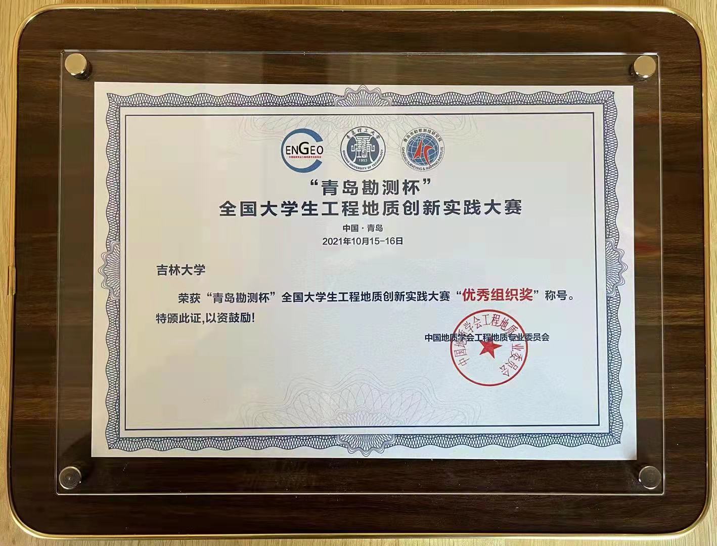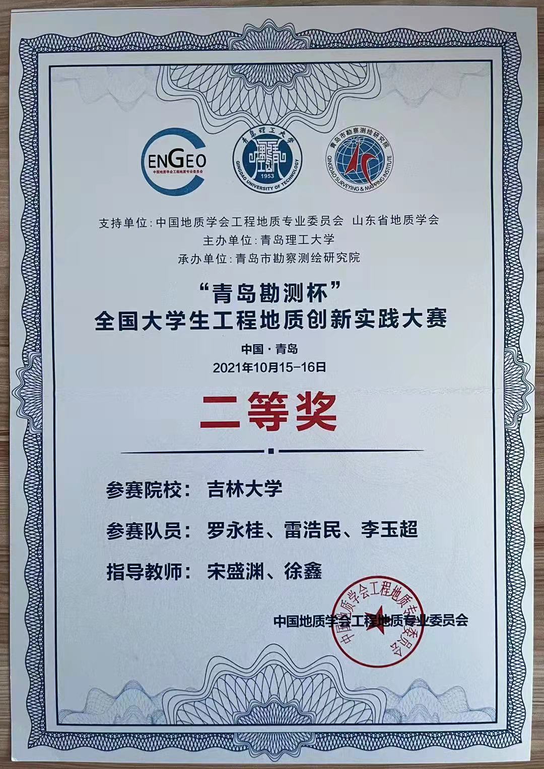On October 15, 2021, the First National Engineering Geology Innovation and Practice Competition for College Students was held in Qingdao. Two teams from the College of Construction Engineering (CCE) got through to the final. Finally, the team consisted of Bai Ji, Li Jincheng and Li Zhihai, jointly mentored by Cao Chen and Chen Hui'e, won the outstanding prize; and the team consisted of Luo Yonggui, Lei Haomin and Li Yuchao, jointly mentored by Song Shengyuan and Xu Xin, won the second prize.
